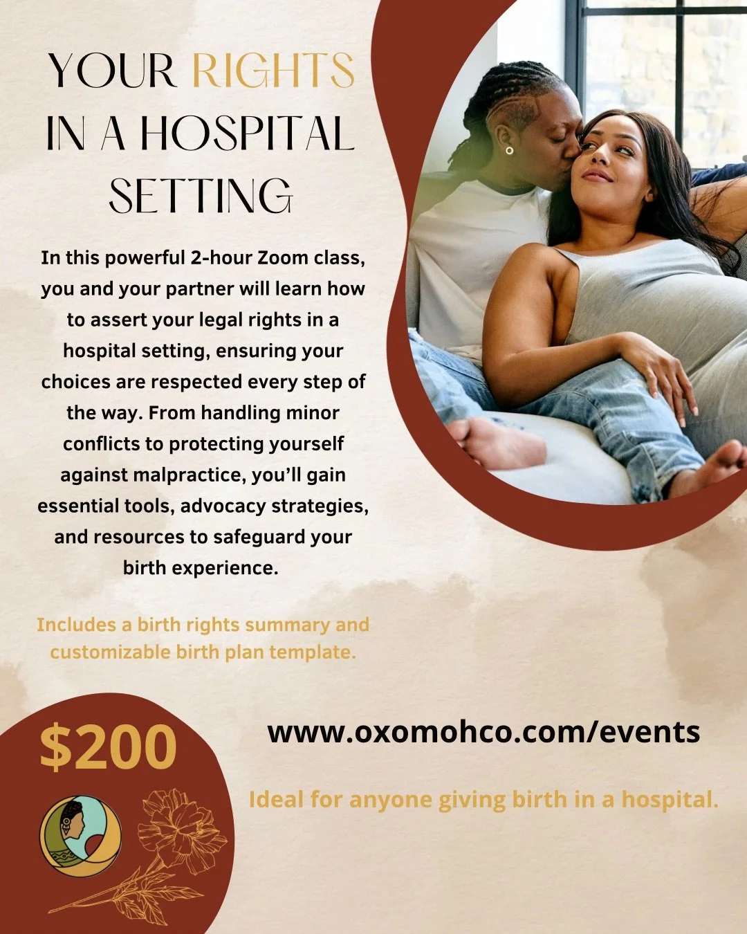 This is a great opportunity for you to get a feel for how we teach and support here at Oxomohco as we will be covering a very important topic: **Your Rights in a Hospital Setting**. This 2-hour class will be held via video call and is priced at $200. Should you choose to proceed with any of our packages, the $200 will be credited toward your package cost.