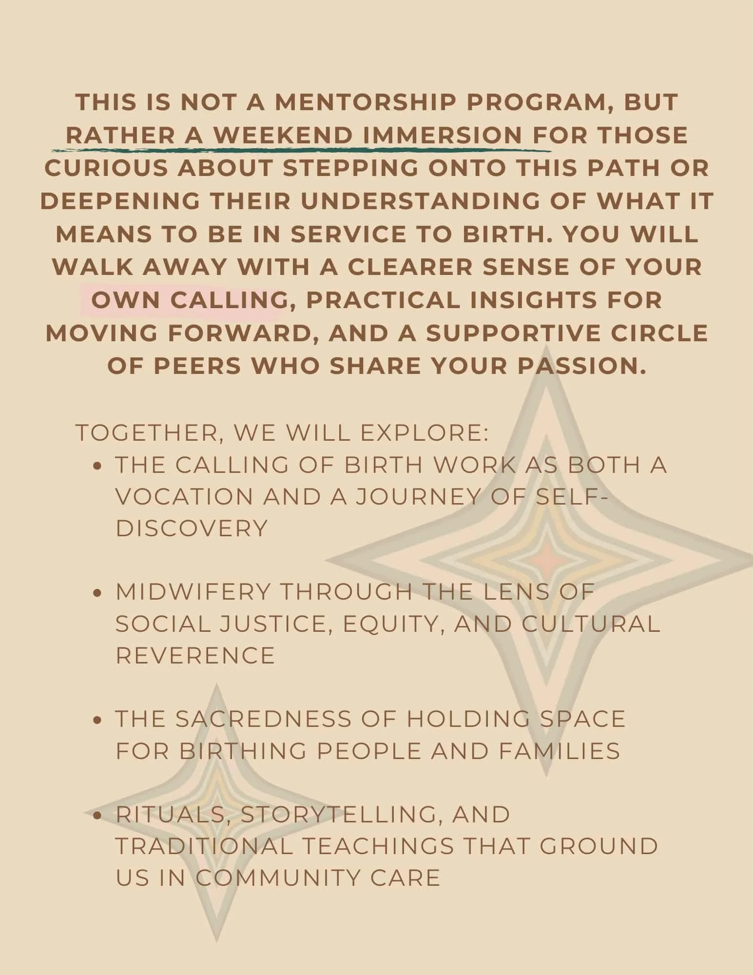 Unveiling the Journey: A Workshop for Aspiring Birth Workers Saturday, January 10, 2026 9:00 AM Sunday, January 11, 2026 6:00 PM Google Calendar ICS RSVP RSVP